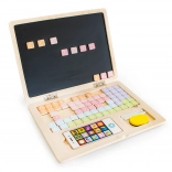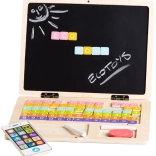Le set comprend un riche assortiment de 78 éléments magnétiques (lettres et chiffres), des craies, une éponge et un « smartphone » en bois pour un jeu encore plus réaliste. Les dimensions compactes 30 × 22 cm facilitent le transport et le rangement – parfait à la maison, en voyage ou à la maternelle.