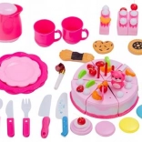 - Gâteau (6 parts avec velcro), roulé (multipart), cupcake, biscuits, gelée, assiettes, tasses, petite cafetière, couverts, couteau, décorations (bougies, fruits, lapins), coupe de glace en 12 pièces, bougie lumineuse
