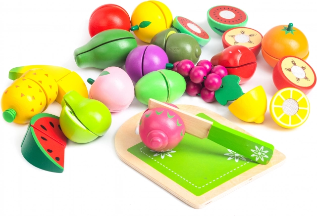 L'ensemble de fruits en bois est fabriqué à partir de matériaux écologiques et couvert de peinture sûre pour les enfants. Il comprend une planche et un couteau en bois pour la découpe, permettant aux enfants de simuler de vraies activités de cuisine. Les fruits sont composés de moitiés réunies par un velcro offrant une légère résistance lors de la découpe et produisant un son comme la découpe de vrais fruits.