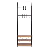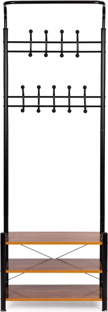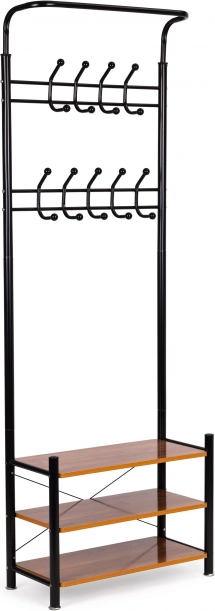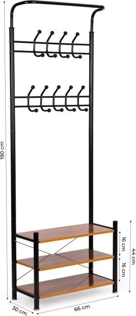 La partie supérieure a deux rangées de 18 crochets, ce qui rend le portemanteau idéal pour les vestiaires domestiques, les bureaux ou les salles d'attente. La partie inférieure contient trois étagères fonctionnelles pour les petits objets, sacs à main ou chaussures. La stabilité est garantie par une base métallique à quatre pieds.