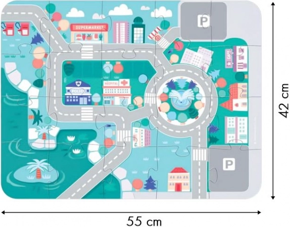 Ce set est peint avec des peintures écologiques sûres pour les enfants. Le chemin urbain sur une base puzzle permet de créer un terrain de jeu complexe qui favorise le jeu créatif et interactif.
