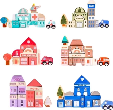 Blocs en bois pour les enfants de plus de 3 ans sont idéaux pour développer la dextérité manuelle et la perception spatiale. Le set contient 115 éléments, incluant divers bâtiments comme un hôtel, un hôpital, une banque, un poste de police, une école et une caserne de pompiers. Chaque bâtiment est conçu en détail et accompagné d'un véhicule correspondant.