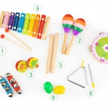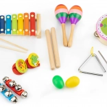grelots à main, maracas (2 pcs), castagnettes (2 pcs), grelots sur bracelets (2 pcs), baguettes rythmiques (2 pcs), triangle, tambourin, hochets (2 pcs), cymbales