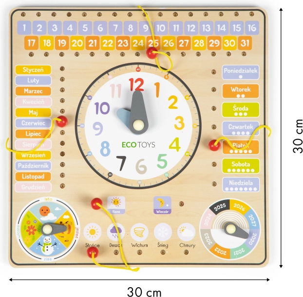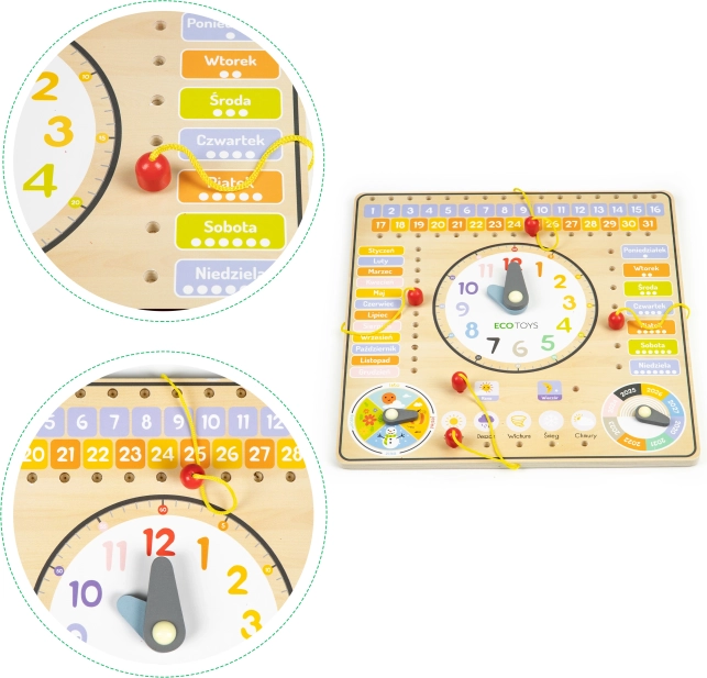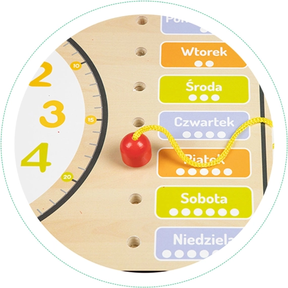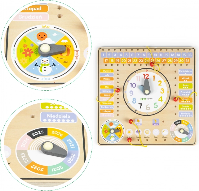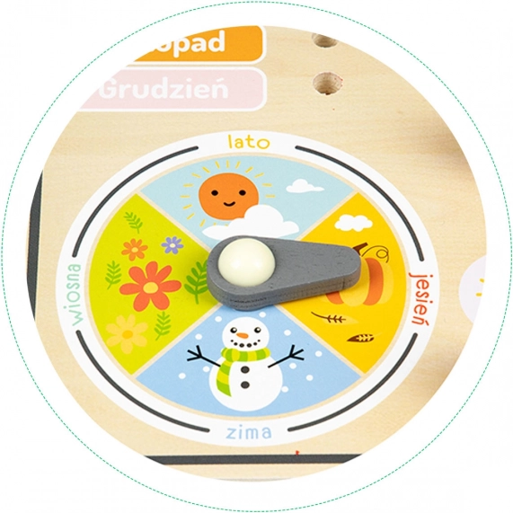 Le tableau contient des inscriptions en polonais, mais il est idéal aussi pour les enfants tchèques grâce à sa grande simplicité et à sa structure en bois résistante. Il permet aux enfants de mieux comprendre la diversité des saisons grâce à un indicateur rotatif. Il est également possible d’indiquer l’année sur la plage 2020-2027.