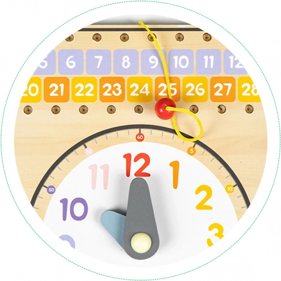 Permettez à vos enfants de découvrir le monde avec ce tableau en bois coloré et sûr. Il apprend aux enfants à reconnaître les jours de la semaine, l’ordre des jours et les périodes mensuelles. Grâce à des cases spéciales, les enfants peuvent marquer les jours sur le calendrier à l’aide d’une ficelle et d’une pince en bois.