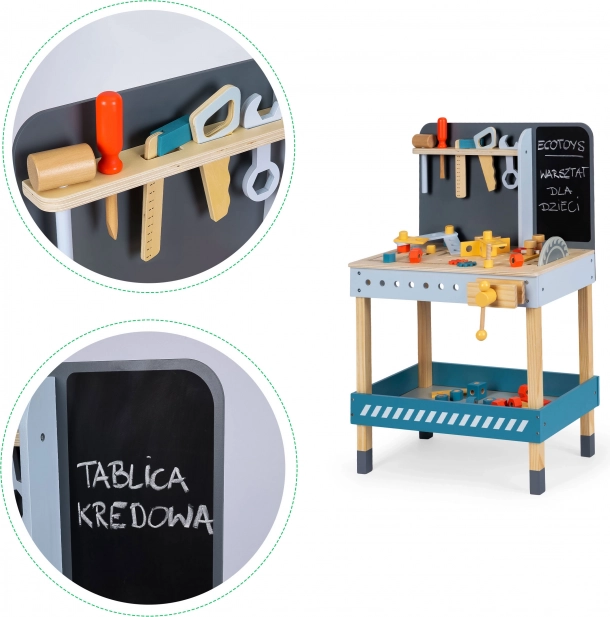 Organisation et ordre : L’atelier possède un grand plan de travail et un organiseur pour le rangement des outils, ce qui apprend aux enfants à maintenir l’ordre dans leur espace de travail. L’enfant peut noter des informations importantes sur le tableau noir intégré à l’atelier.