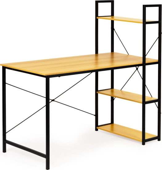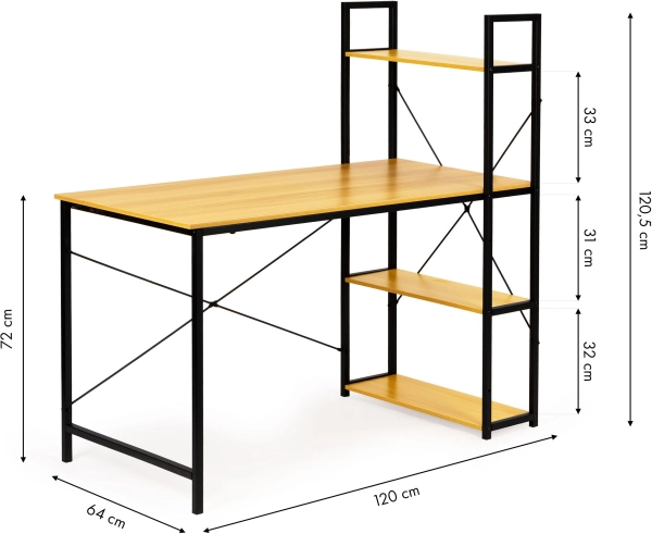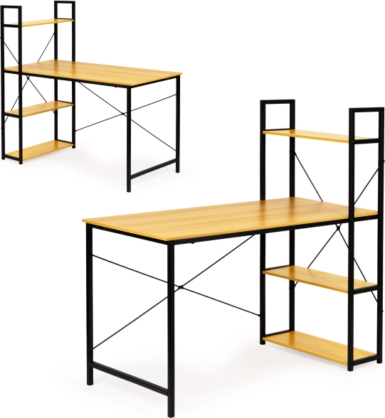 Le bureau offre une grande surface de travail et un montant latéral avec quatre étagères pour ranger livres, documents ou décorations. L’ensemble de la structure est conçu pour la durabilité et la longévité, grâce à des matériaux tels que le panneau MDF et l’acier revêtu par poudre.