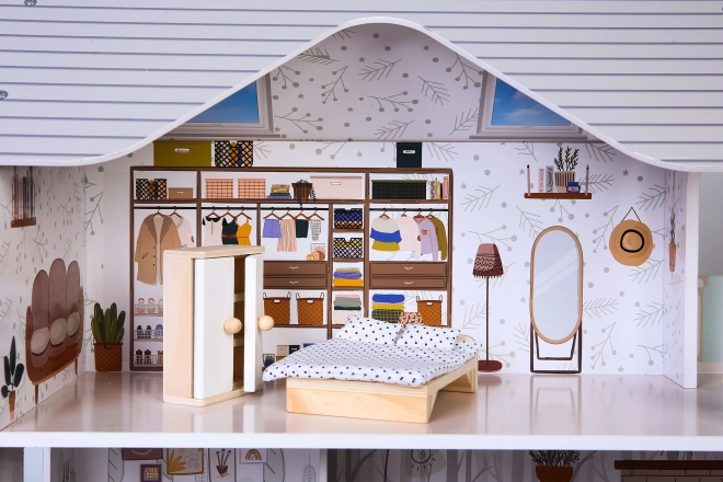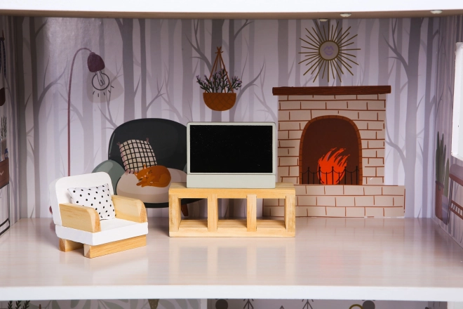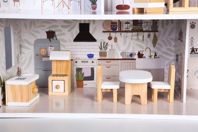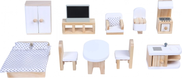 La maison comprend trois niveaux distincts et au total quatre pièces, chacune stylisée selon sa fonction. L'emballage inclut 10 pièces de mobilier en bois et divers accessoires tels qu'un aspirateur, une guitare, un miroir ou une cabane pour chien. Chaque élément peut être déplacé et réorganisé selon les besoins.