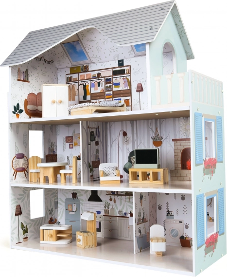 La maison a trois étages et six pièces aménagées différemment pour des possibilités de jeu infinies.