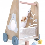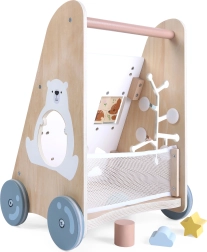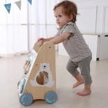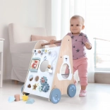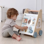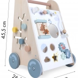 Le trotteur en bois pour enfants à partir de 18 mois offre non seulement une aide à l’apprentissage de la marche, mais aussi de nombreuses activités ludiques développant la motricité fine. Le panneau éducatif comprend :