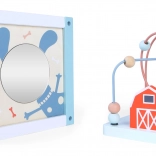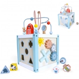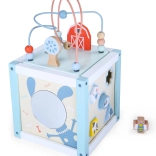 Le cube est équipé d'un labyrinthe avec perles, d'un miroir et d'engrenages rotatifs qui développent la motricité fine des enfants.