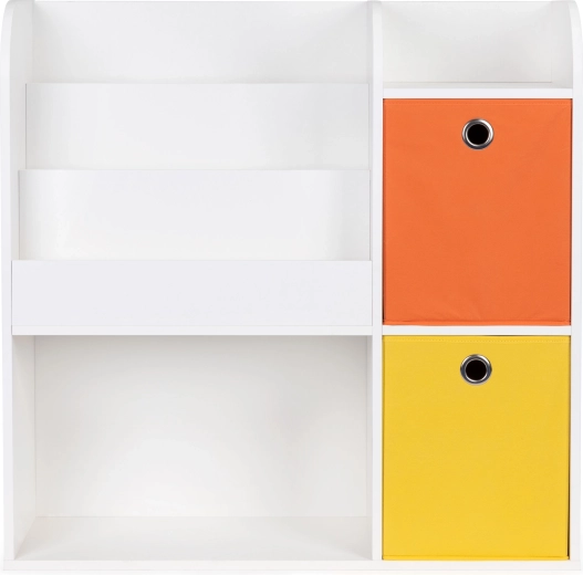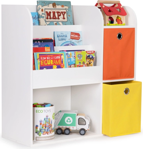 Le meuble est fabriqué en panneau de particules résistant et fini avec une placage résistant aux dommages. Les compartiments profonds accueilleront vos livres, albums, cahiers de coloriage et magazines préférés, et les étagères seront idéales pour ranger les jouets. Le set comprend en plus 2 paniers textiles spacieux, idéals pour les blocs et autres accessoires.