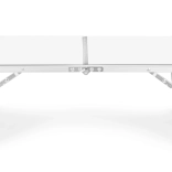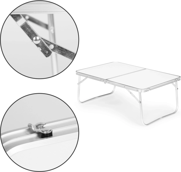 Une fois pliée, la table prend la forme d’une mallette avec poignée intégrée. Elle se transporte et se range facilement dans la voiture, le camping-car ou à la maison.