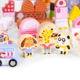 Créez une ville gourmande pleine de glaciers, de pâtisseries et de jolis détails. Les blocs en bois colorés avec des motifs de nourriture, de chiffres et de lettres favorisent l’apprentissage par le jeu – en construisant, les enfants entraînent naturellement la reconnaissance des formes, des couleurs et des symboles.