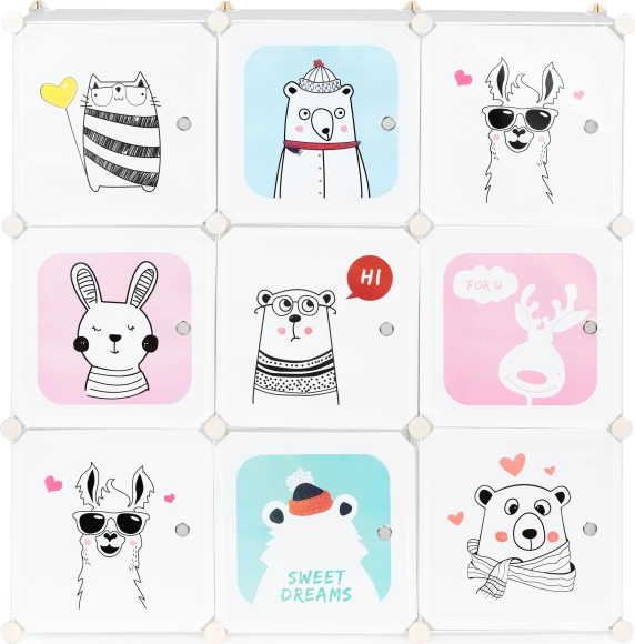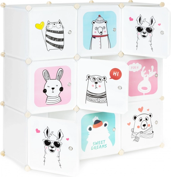 Cette armoire modulaire pour enfants apporte de l’ordre et une touche ludique à la pièce. Neuf cubes séparés avec portes faciles à ouvrir accueillent jouets, livres et vêtements, tandis que les illustrations colorées d’animaux rendent l’espace plus chaleureux et stimulent l’imagination. Sa construction légère est sûre pour les enfants et leur permet de garder la chambre en ordre de manière autonome.