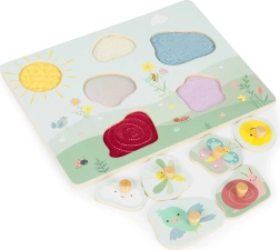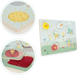Ce puzzle sensoriel stimule la curiosité naturelle des enfants : en insérant les pièces, ils explorent différentes couleurs, formes et textures, renforçant leur motricité fine, la coordination œil–main et les compétences cognitives. Chaque pièce dispose d’une poignée en bois pour une prise en main confortable, même pour les petites mains.