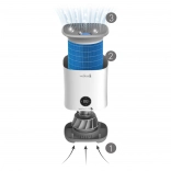 Aspiration de l’air sec, enrichissement en micro-particules d’eau via le filtre et diffusion à 360° d’une brume invisible dans toute la pièce.