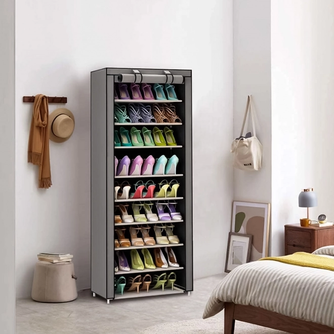 Cette armoire en tissu pratique à plusieurs niveaux de rangement vous aide à garder de l'ordre dans vos vêtements, accessoires et chaussures. Grâce à ses dimensions compactes 58 × 28 × 161 cm, elle trouve sa place même dans les petits espaces. Elle offre jusqu'à 9 étagères, une structure métallique robuste avec raccords en plastique et une housse enroulable à deux fermetures éclair contre la poussière. S'y ajoutent une poche latérale pour les petits objets et un montage facile sans outils.