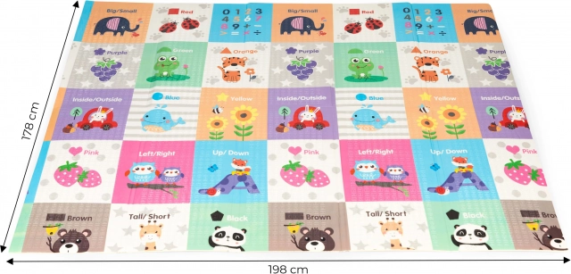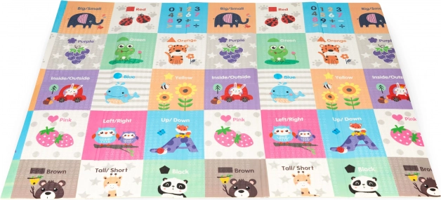 Un côté avec des routes pour les trajets imaginaires et le développement de la motricité, l’autre avec des animaux, des chiffres et des couleurs pour un apprentissage ludique.