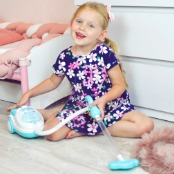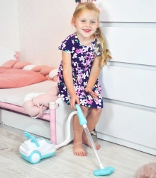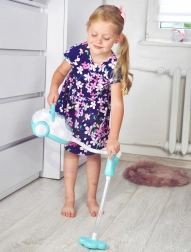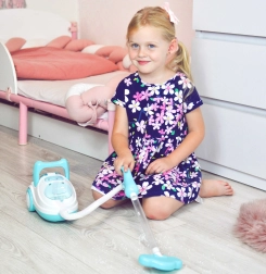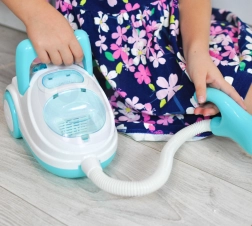 Cet aspirateur pour enfants bleu et blanc imite fidèlement un vrai appareil électroménager : une fois allumé, il s’illumine, émet des sons réalistes et, grâce à sa fonction d’aspiration, peut avaler les billes en polystyrène fournies. Idéal pour le jeu de rôle, il encourage le sens des responsabilités et apprend de façon ludique à maintenir l’ordre.