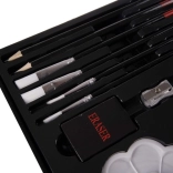 28× crayons de couleur, 33× feutre, 24× pastel à l’huile, 24× aquarelle, 24× peinture acrylique, 2× gomme, 2× palette, 2× crayon, 4× pinceau, 1× taille-crayon, 1× valisette