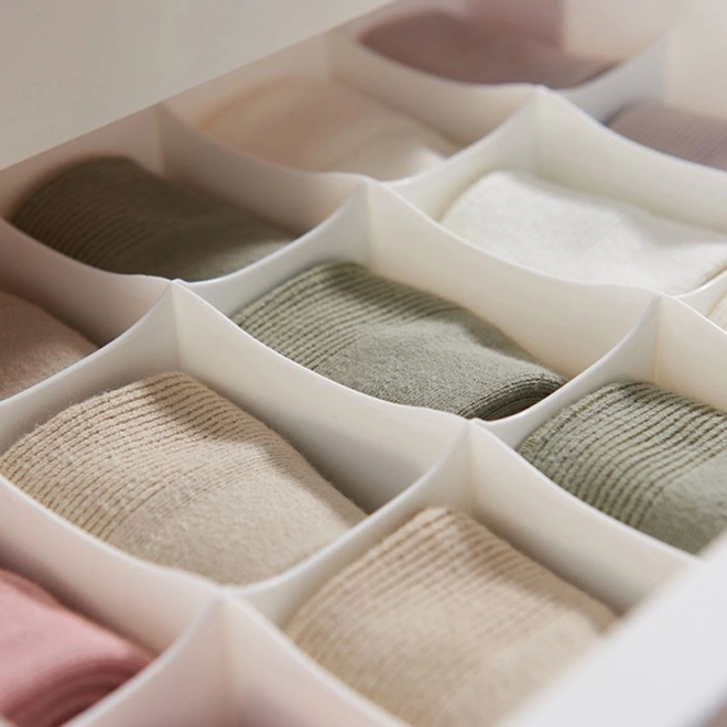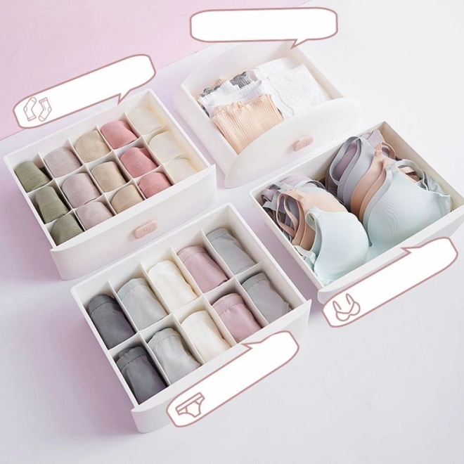 - 1× tiroir pour soutiens-gorge; 1× tiroir avec 15 compartiments (chaussettes); 1× tiroir avec 10 compartiments (culottes); 1× tiroir universel sans séparations