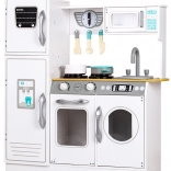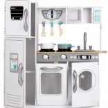 Cuisine pour enfants élégante en bois massif pour de petits chefs dès 3 ans. Elle offre des boutons de commande réalistes avec clic, un réfrigérateur ouvrant, un four et un micro-ondes, un évier spacieux et même une « machine à laver » pour le jeu de la maison. Inclus, 5 accessoires de cuisine en bois pour des heures de jeu créatif et le développement de l’imagination et de la motricité fine.