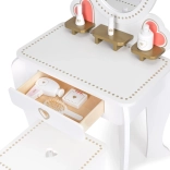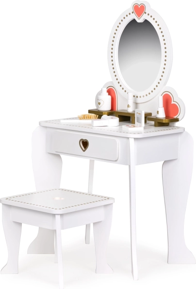 La coiffeuse avec un grand miroir et un cadre décoratif avec motifs de cœurs est parfaite pour jouer au rôle de petite princesse ou de maquilleuse. La construction est sûre et offre suffisamment d'espace pour les jeux imaginatifs.