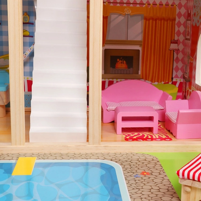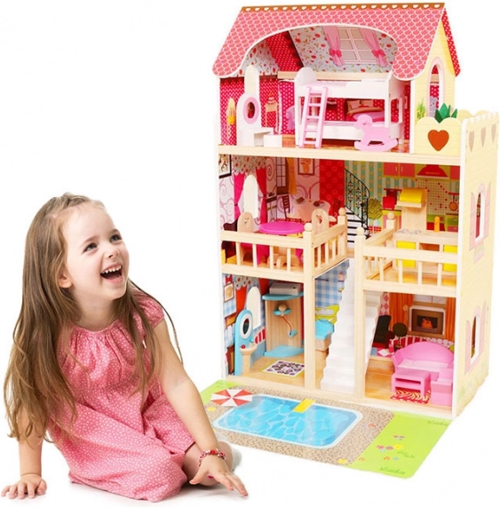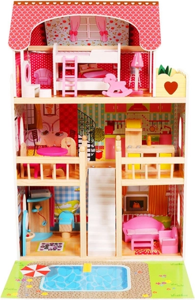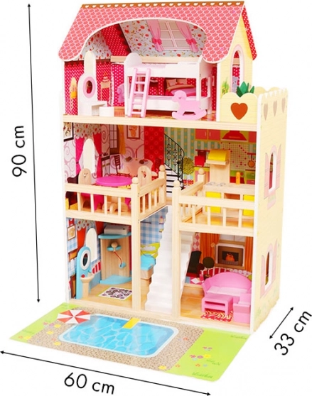 La grande maison de poupées en bois ECOTOYS offre 3 étages et 6 pièces, un éclairage LED pour une ambiance magique et 16 éléments de mobilier en bois. Sa construction est stable et sûre, idéale pour les enfants à partir de 3 ans, et stimule l’imagination, la créativité et la motricité fine. Elle comprend également un tapis de jeu avec motif de piscine pour des jeux encore plus amusants.
