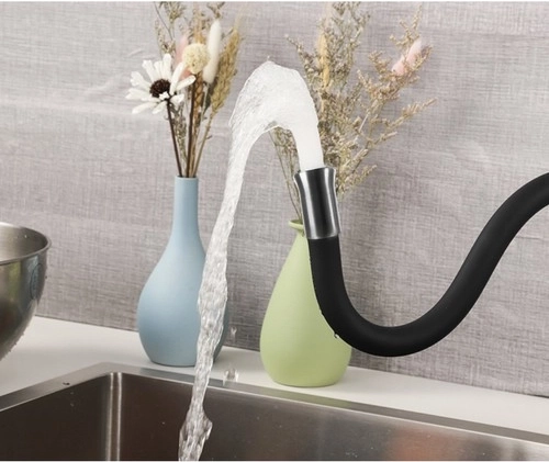 Le bec élastique et modelable permet d’orienter le jet exactement là où vous en avez besoin – du rinçage des légumes au remplissage de récipients hauts. Idéal également pour les éviers placés sous une fenêtre.