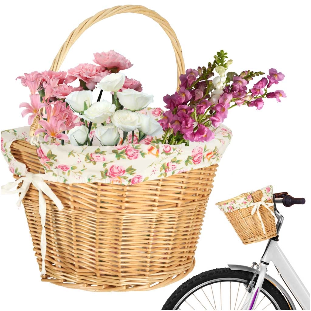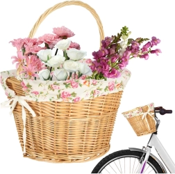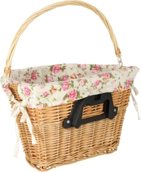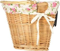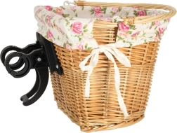 Panier en osier stylé pour guidon avec doublure textile fleurie, idéal pour les trajets quotidiens en ville comme pour les balades du week‑end. Il offre un système de fixation rapide click pour un retrait facile, une construction en osier robuste et une poignée pratique pour un transport confortable. La doublure à motif floral apporte du charme au vélo et protège le contenu.