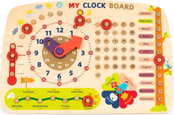 Le tableau permet aux enfants d’apprendre les jours de la semaine, les mois et les saisons, une excellente manière de développer de façon ludique les aptitudes manuelles.