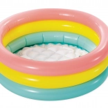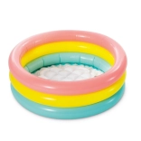Trois anneaux gonflables aux teintes vibrantes de rose, jaune et vert ajoutent à l'attrait de la piscine et encouragent les enfants à jouer.