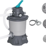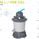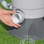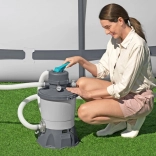 Grâce à sa capacité de 3596 l/h, la pompe est idéale pour des piscines d’un volume de 1 100 à 18 100 litres. Pour fonctionner, elle nécessite une charge de sable (sable de quartz n°20, granulométrie 0,45–0,85 mm, environ 8,5 kg) ou des billes filtrantes haute performance Polysphere™ d’environ 240 g.