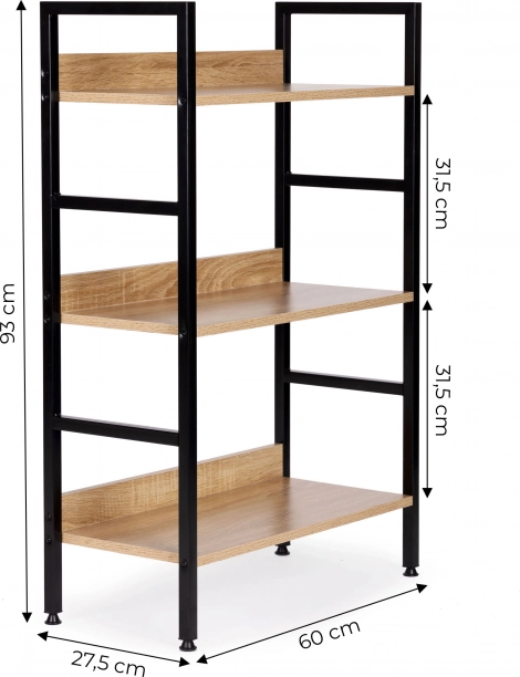 Étagère loft élégante à trois niveaux offrant un design moderne, une structure métallique stable et une utilisation universelle dans le salon, la chambre, l’entrée et la salle de bain. Des panneaux MDF aspect bois de qualité sur un cadre revêtu par poudre, des pieds réglables avec protection du sol et un montage facile en font une solution de rangement idéale pour décorations, livres et plantes.