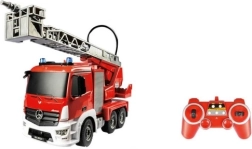 Grand camion de pompiers sous licence, télécommandé à l’échelle 1:20, qui ravira les petits comme les grands fans des secours. Il offre un éclairage LED réaliste, une pompe à eau fonctionnelle avec réservoir intégré, une plateforme/échelle rotative et extensible et des roues en caoutchouc avec transmission 4x4. La radiocommande ergonomique 2,4 GHz à joysticks assure un pilotage fluide, avec klaxon, sirènes et bouton de démarrage.