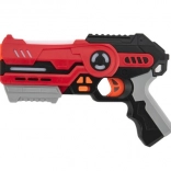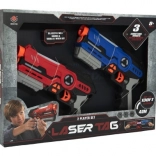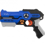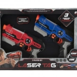 Profite d'un jeu d'action à la maison comme en plein air avec un kit de deux pistolets laser pour deux joueurs. Il offre des effets lumineux et sonores, la détection des touches jusqu'à 40 m et un indicateur de vies via 3 LED. L'alimentation est assurée par 3× piles AA par pistolet (non incluses). Convient à partir de 8 ans.