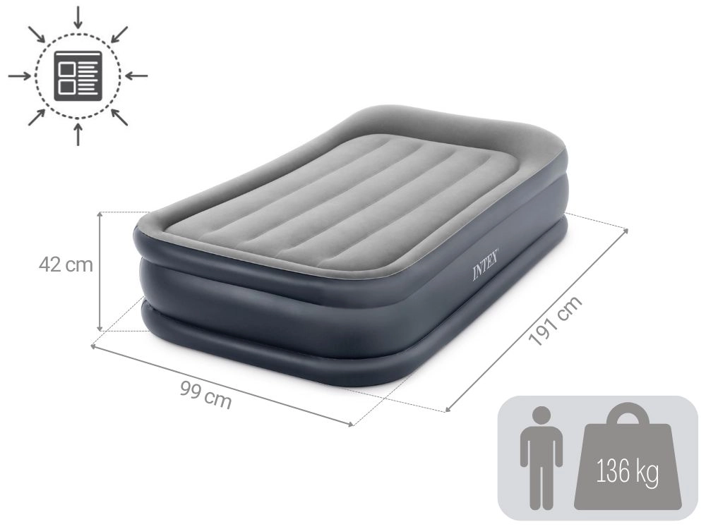 Vous cherchez un couchage d’appoint confortable et stable pour des invités, le chalet ou les voyages ? Le lit gonflable une place INTEX d’une hauteur de 42 cm offre un confort comparable à un lit classique. La surface en velours est agréable au toucher et empêche le drap de glisser, tandis que la pompe électrique intégrée (220–240 V) assure une préparation rapide pour dormir.