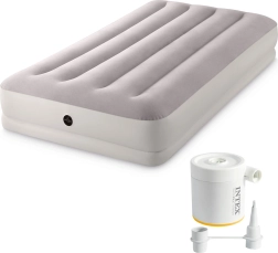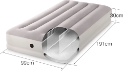 Pratique matelas gonflable de la marque INTEX aux dimensions 191 × 99 × 30 cm pour un sommeil confortable d’une personne à la maison comme en voyage. Grâce à la technologie Dura-Beam Fiber, il est stable et soutient bien le corps. La surface floquée type velours est douce au toucher et antidérapante. Inclus, une pompe électrique USB compacte pour un gonflage et un dégonflage rapides, ainsi qu’un sac de transport pour un transport facile.