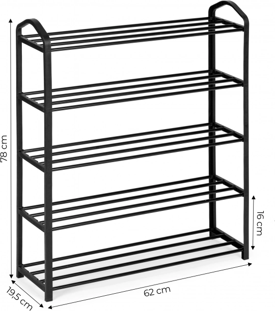 Cette étagère à chaussures en métal est la solution parfaite pour votre couloir, vestiaire ou même bureau. Cinq étagères permettent de ranger jusqu'à 15 paires de vos chaussures préférées et sa construction légère assure une stabilité même en cas de charge complète.