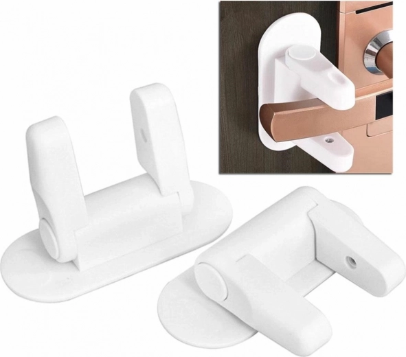 Dispositif de sécurité pour poignée empêchant les jeunes enfants d’ouvrir une porte ou une fenêtre. Il possède une large base permettant une installation solide du dispositif de sécurité derrière la poignée au moyen d’un ruban adhésif. Le verrou adhère fermement à toute surface de porte et au cadre de fenêtre. Les bras atteignent une profondeur de 7 cm, empêchant l’ouverture de la poignée. Les boutons doubles sur les bras permettent un déverrouillage rapide et une utilisation par les personnes autorisées :)