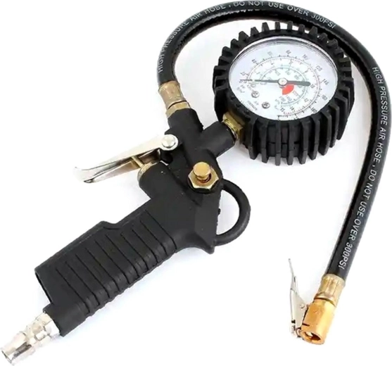 Pistolet à air compact pour le gonflage des pneus. La conception simple de l’appareil facilite le travail et le manomètre clair permet d’afficher la pression actuelle simultanément dans plusieurs unités (PSI / BAR). Une utilisation confortable est assurée par un tuyau flexible pratique avec une valve standard.