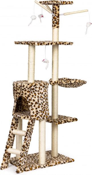 Arbre à chat multifonction de 138 cm offrant 5 niveaux de divertissement, 3 plates-formes d’observation, une maisonnette spacieuse pour dormir, un hamac suspendu et quatre petites souris suspendues pour jouer. Sa structure stable avec poteaux en sisal robustes protège vos meubles et le revêtement en peluche douce garantit un confort maximal.
