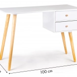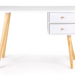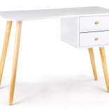 Le bureau élégant ModernHome se distingue par son design scandinave minimaliste, parfait pour les intérieurs contemporains. Les pieds en pin au fini naturel s’harmonisent avec le plateau blanc et assurent solidité et stabilité. Deux tiroirs pratiques gardent documents, cahiers et petits objets toujours à portée.