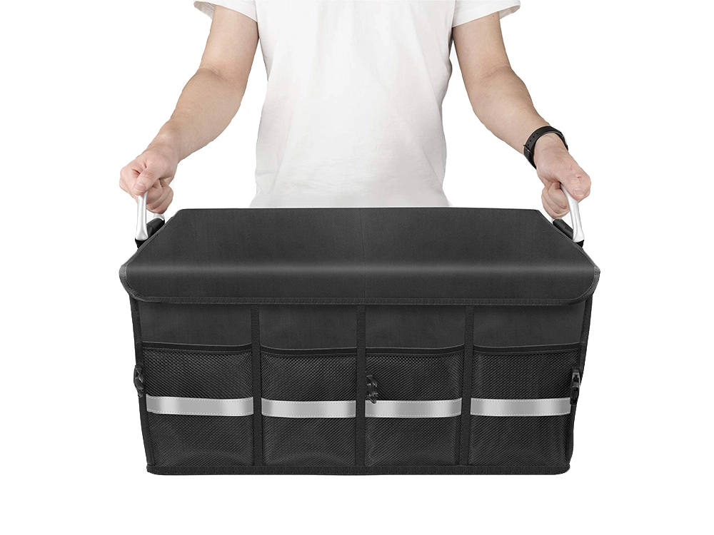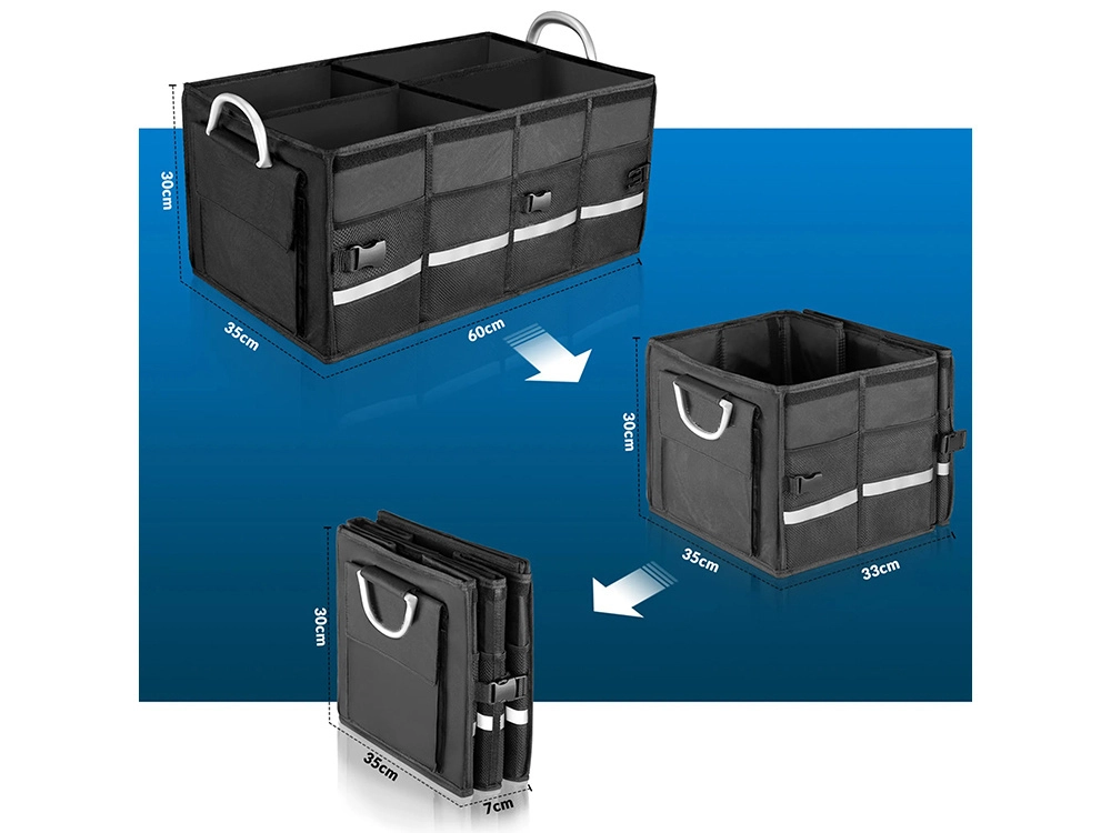 L’organiseur se plie rapidement à plat lorsque vous n’en avez pas besoin. Des poignées renforcées facilitent le transport même lorsque la caisse est bien chargée.