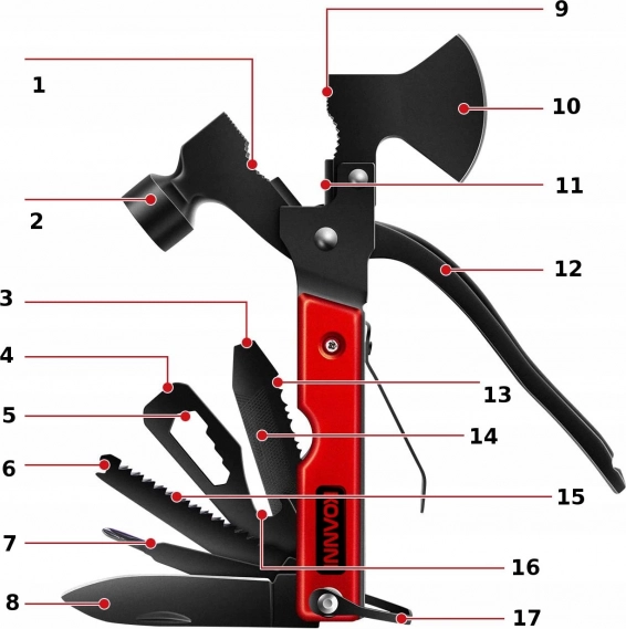 - 17 outils en 1 – hachette, marteau, pinces, couteau, scie et plus encore