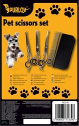 Kit complet pour couper le pelage de votre chien, dans un étui pratique. Lames tranchantes en acier inoxydable, pointes arrondies sécurisées, poignées ergonomiques antidérapantes et riche assortiment d’accessoires (ciseaux droits, désépaississeurs et ciseaux courbés, peigne métallique, pinces, chiffon de nettoyage et clé de réglage) pour un toilettage précis et doux à la maison comme en salon.
