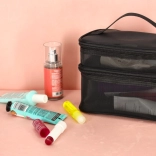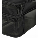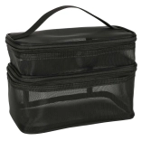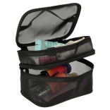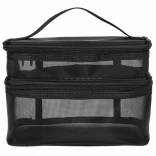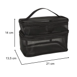 Pratique trousse de toilette noire, idéale aussi bien pour les voyages que pour un usage domestique. Elle est équipée de deux compartiments permettant une organisation facile des produits de beauté. Fabriquée en matériau maillé respirant, qui offre une vue rapide sur le contenu. Une poignée pratique assure un transport aisé.