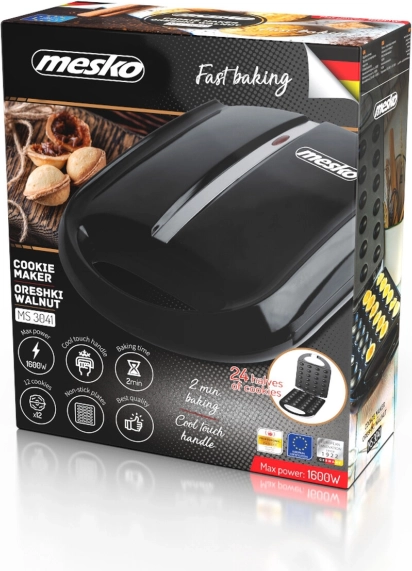 Préparez des biscuits aux noix légendaires en quelques minutes. Le gauffrier MESKO XL cuit d’un seul coup 24 demi-coquilles avec un revêtement antiadhésif, offre un chauffage rapide jusqu’à 1600 W et, grâce aux poignées thermo-isolées et au verrouillage du couvercle, il s’utilise de manière sécurisée et confortable.