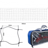 Filet de volley-ball universel pour une utilisation en extérieur comme en salle, dimensions 9,5 × 1 m, équipé d’un câble tendeur en acier gainé de plastique. Structure légère et compacte en plastique résistant, permettant une fixation rapide aux poteaux, arbres ou autres supports stables. Inclut un sac de transport pour un port et un rangement faciles.